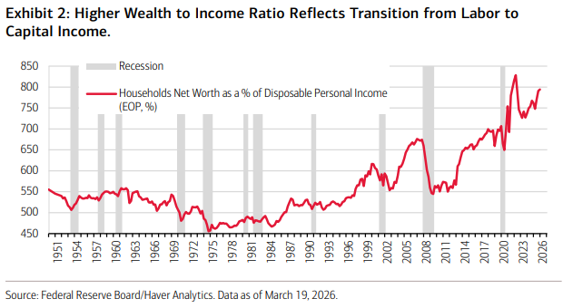 Μια άλλη πτυχή αυτού του νέου κόσμου που κυριαρχείται από το εισόδημα κεφαλαίου είναι η αυξανόμενη αναλογία πλούτου προς εισόδημα, η οποία χρονολογείται από την αρχή του διαδικτύου. Καθώς το απόθεμα πλούτου αυξάνεται σε σχέση με το διαθέσιμο προσωπικό εισόδημα, αυτό υποδηλώνει ότι τα νοικοκυριά έχουν ένα μεγαλύτερο απόθεμα μελλοντικού εισοδήματος για να αντλήσουν όταν χρειαστεί. Η γήρανση του πληθυσμού συμβάλλει στην ώθηση αυτής της τάσης, καθώς οι άνθρωποι συσσωρεύουν αποταμιεύσεις για τα μη εργάσιμα έτη συνταξιοδότησής τους. Αυτό καθιστά την οικονομία πιο ευάλωτη σε μεγάλες διακυμάνσεις στις αξίες των περιουσιακών στοιχείων, όπως οι τιμές των μετοχών, όπως πολλοί απαισιόδοξοι αναλυτές συνηθίζουν να σημειώνουν. Ωστόσο, καθιστά επίσης τη συνολική ζήτηση λιγότερο ευάλωτη σε κυκλικές υφέσεις, επειδή ένα μεγάλο απόθεμα αποταμιεύσεων μπορεί να αντληθεί για μια δύσκολη μέρα. Ουσιαστικά, βοηθά στην εξομάλυνση της κυκλικότητας της οικονομίας.