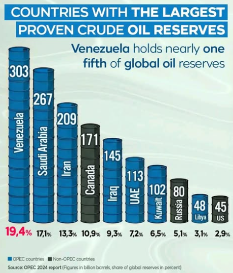 Η Βενεζουέλα είναι η πλουσιότερη χώρα παγκοσμίως σε αποθέματα πετρελαίου. Τα αποθέματα αυτά υπολογίζονται σε 303,2 δισ. βαρέλια (στοιχεία 2023), σχεδόν το 1/5 του αποθέματος στον πλανήτη. Η αξία των αποθεμάτων αυτών ξεπερνά τα $17 τρισ.