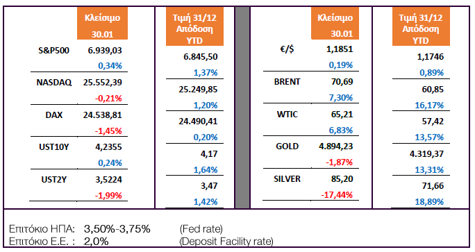 (i) η πτώση (σε χαμηλό 4 ετών) και η ανακαμψή του δολαρίου σε όλες τις σειρές. Το ευρώ ανέβηκε από το 1,1828 στο 1,2041 καθώς από τη μια Fed και BOJ φέρονταν ότι προσπάθησαν να μετρήσουν τον αντίκτυπο μίας παρέμβασης για να σταματήσει η πτώση του γιεν και από την άλλη ο Τραμπ ανέφερε (27.01) ότι το δολάριο ψάχνει το δικό του δίκαιο επίπεδο και δεν τον νοιάζει η πτώση του δολαρίου, αλλά τελικά να υποχωρεί την Παρασκευή στο 1,1850 λόγω ισχυρών μάκρο με Chicago PMI ΙΑΝ: 54,0 με εκτ 43,7 και προηγ 42,7) σε αύξηση-ανάπτυξη μετά από 25 μήνες και την επιλογή Kevin Warsh για την προεδρία της Fed που θεωρείται λιγότερο επιθετικός για την πολιτική επιτοκίων, που σημαίνει ισχυρό δολάριο.