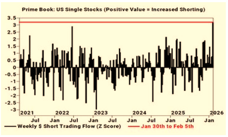 Οι επενδυτές εστίασαν και στις μεγάλες επενδύσεις (CAPEX) των Amazon και Alphabet που ανακοινώθηκαν (Δες παρακάτω). Και σε αυτή την περίπτωση προτίμησαν να πάνε με τις σίγουρα ωφελούμενες εταιρίες και έτσι την Παρασκευή είδαμε σημαντικές αποδόσεις στις: Nvidia +7,9%, Broadcom +7,2%, AMD +8,3%, Intel +4,9% ενώ οι μετοχές των AMZN και Google πιέστηκαν -12,1% και -4,5% αντίστοιχα (εβδομαδιαίες αποδόσεις). Παρολαυτά, η ανοδική κίνηση της Παρασκευής οφείλεται κατά πολύ σε κάλυψη θέσεων καθώς από 30.01-05.02 είχε σημειωθεί η μεγαλύτερη αύξηση short μεμονωμένων μετοχών της τελευταίας 5ετίας (Πηγή: Goldman Sachs):
