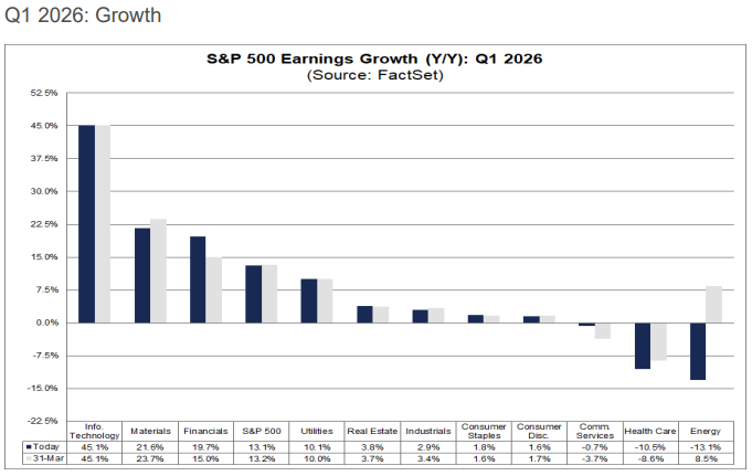 Με την εικόνα μιας πιθανής ειρήνευσης, οι επενδυτές συνέχισαν να επανέρχονται στις αγορές μετοχών εστιάζοντας πλέον στα καλύτερα μικρο και μακρο στοιχεία. Για τo EPS Q1:2026 του SPX προβλέπεται αύξηση +13,1% με την μεγαλύτερη αύξηση να σημειώνεται στην τεχνολογία +45% και ειδικά στους ημιαγωγούς με +95%.