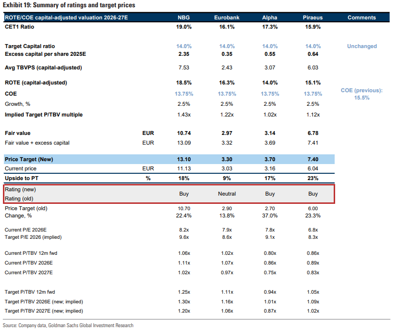 Η Goldman Sachs με έκθεσή της (Greece Banks – Reiterate constructive view; thoughts into Q2 results; estimates update, 08.07.2025) αναφέρει ότι το δυνατό ράλυ αυτό οφείλεται σε έναν συνδυασμό ιδιοσυγκρασιακών παραγόντων που σχετίζονται με την Ελλάδα και σε μια επαναξιολόγηση των ευρωπαϊκών τραπεζών.